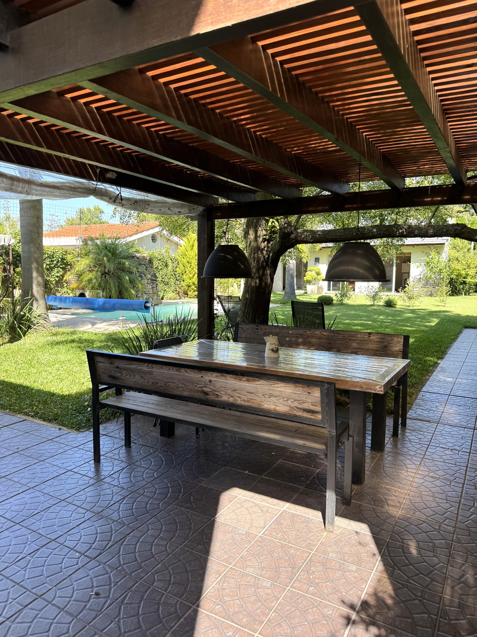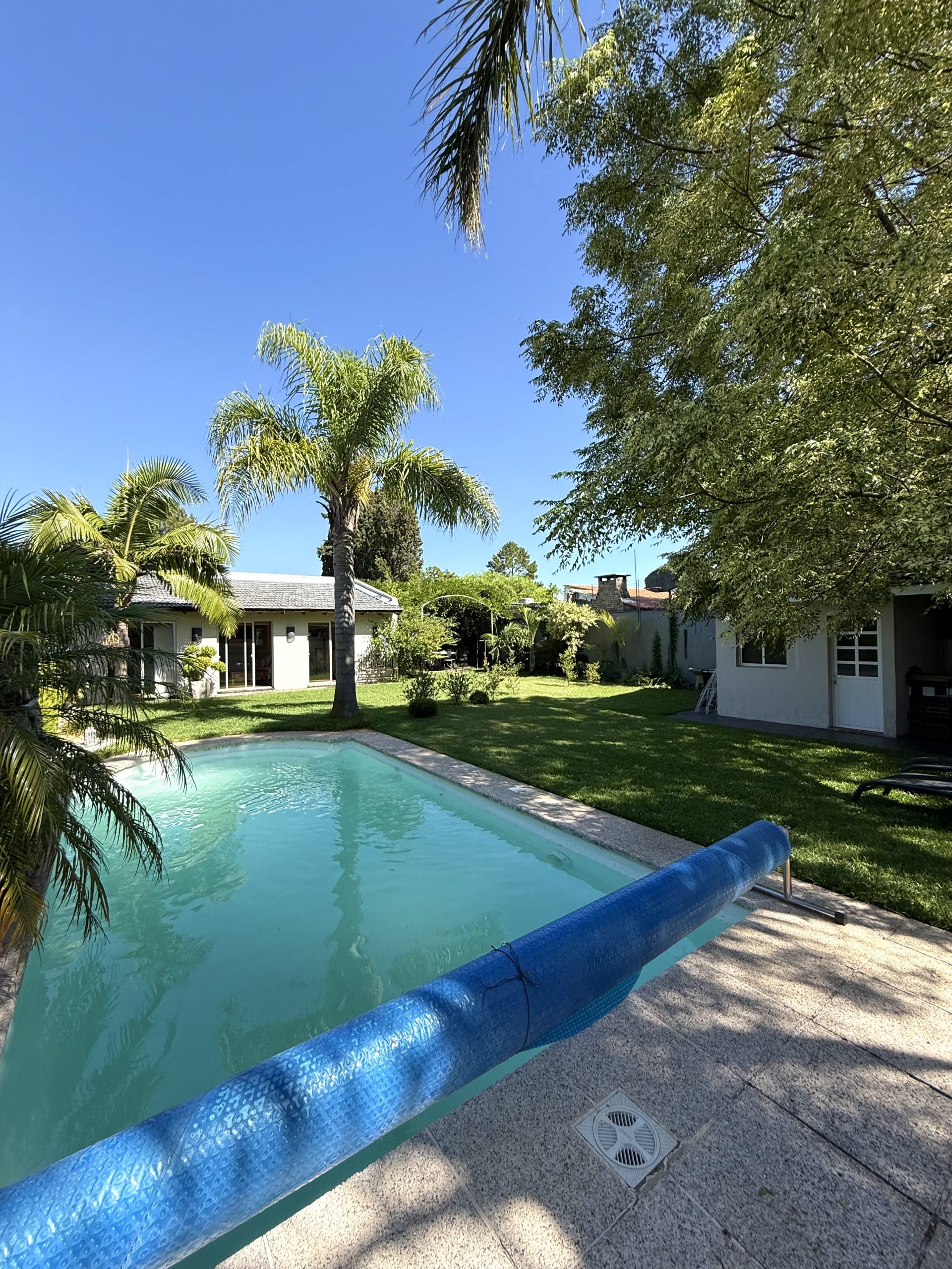 Gran fondo parquizado con piscina, parrillero techado con barra y espacios exteriores ideales para disfrutar todo el año.
